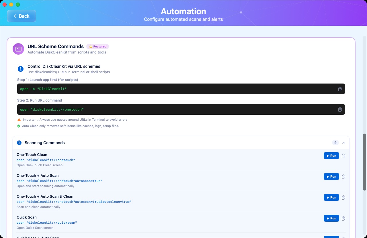 For advanced automation, use URL schemes to trigger DiskCleanKit from Terminal, AppleScript, macOS Shortcuts, or any automation tool.