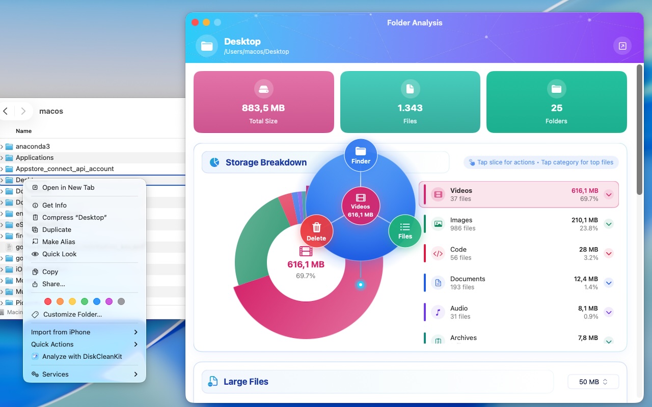 Finder Integration is DiskCleanKit's most powerful workflow feature. Instead of opening an app and navigating to folders, simply right-click any folder in Finder and select "Analyze with DiskCleanKit" - a floating analysis panel appears instantly with a complete storage breakdown.